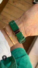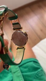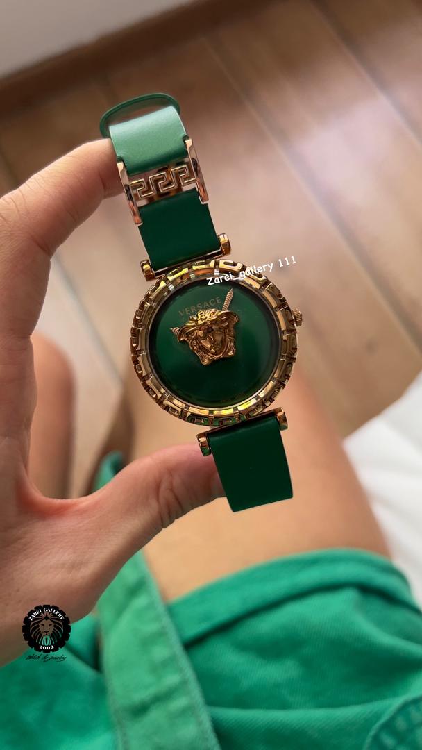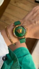 بند چرمی سبز بدون دوخت با پلاک طلایی ورساچه روی بند و قفل پروانه ای فشاری استیل با حک ورساچه روی قفل که به راحتی سایز میشود