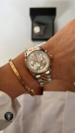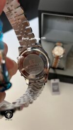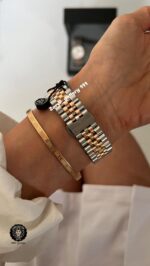 رنگ محصول قاب و بند دو رنگ رزگلد و استیل با صفحه نقره و اعداد و عقربه رزگلد