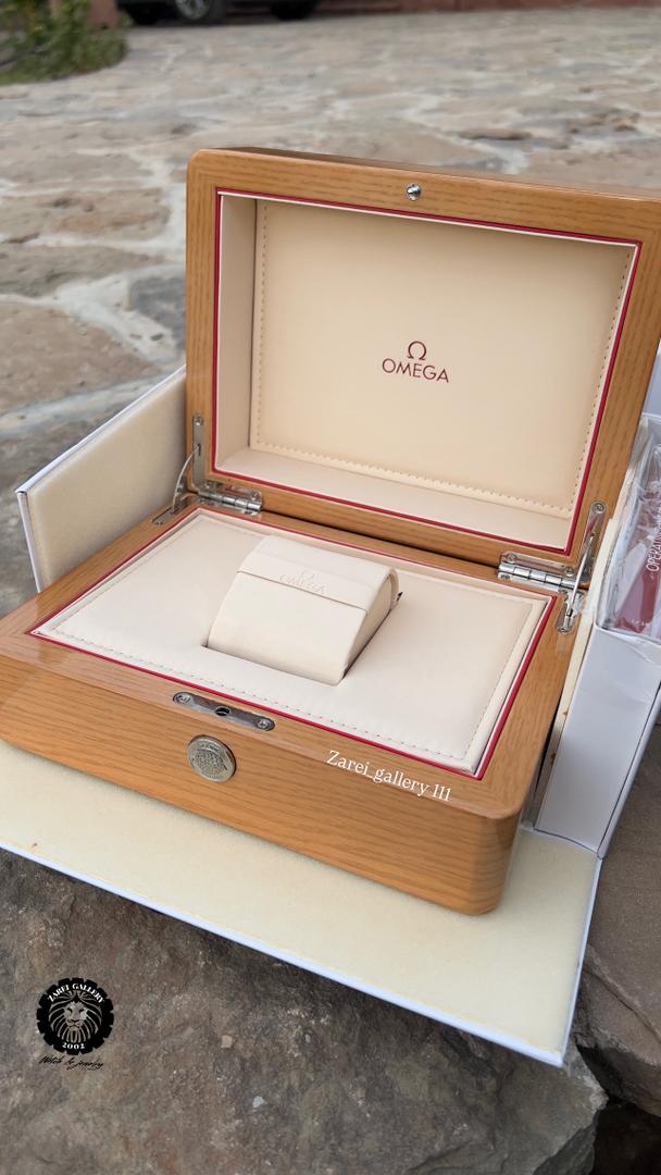 جعبه داخل کاور جعبه سفید با ابر ضربه گیر داخل جعبه یک کیف جا کارتی امگا با سه عدد کارت ضمانت و یک شناسنامه و دفترچه اصلی امگا که داخل باکس قرار دارد با لیبل امگا همگی موقع سفارش با کاور و پاکت اصلی امگا ارسال می شود