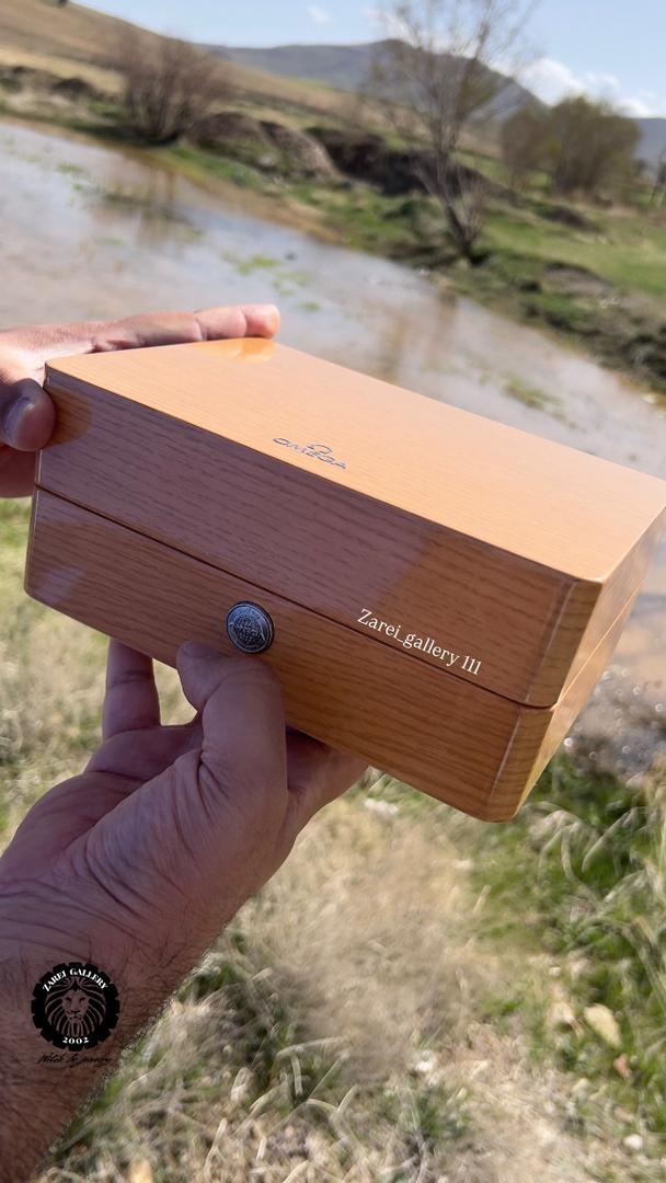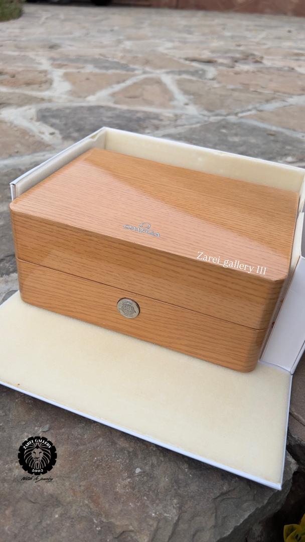 جعبه تمام چوب طبیعی با داخل چرم ساتنی با قفل فشاری با لوگوی امگا و درب چوبی با لولاهای استیل