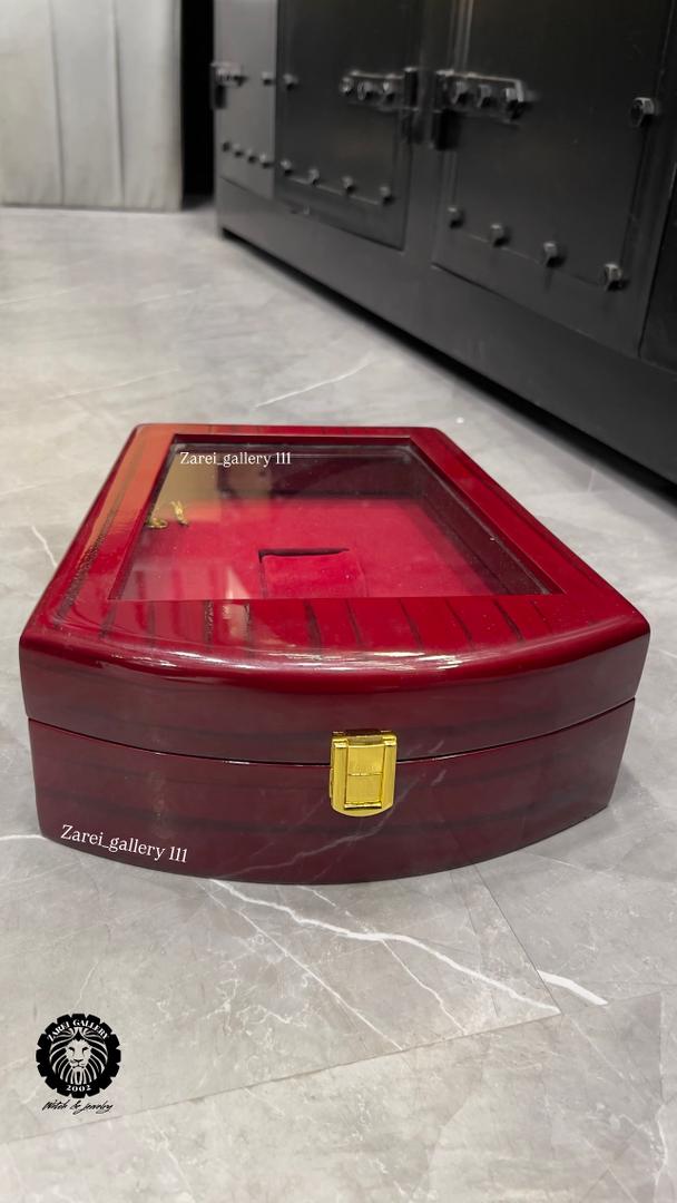 جعبه تمام چوب طبیعی با رنگ زرشکی با رگه های مشکی با بالشتک لوکس تک خانه با درب دور چوبی و داخل شیشه ای و قفل فشاری و لولاهای طلایی فلزی با لوگوی فلکسی طلایی