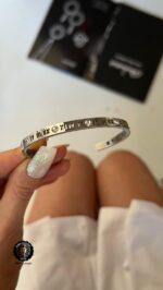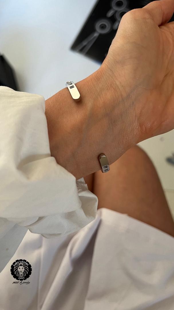 دستبند به صورت تو خالی و تمام اعداد یونانی به صورت لیزر و با تک نگین مخراج طراحی شده