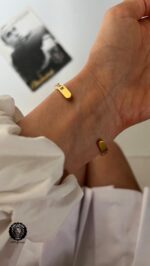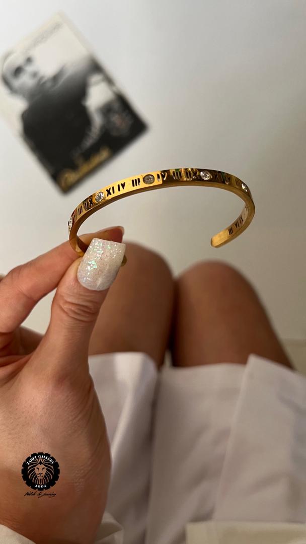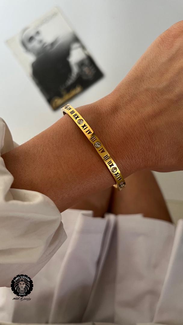 دستبند به صورت تو خالی و تمام اعداد یونانی به صورت لیزر و با تک نگین مخراج طراحی شده