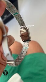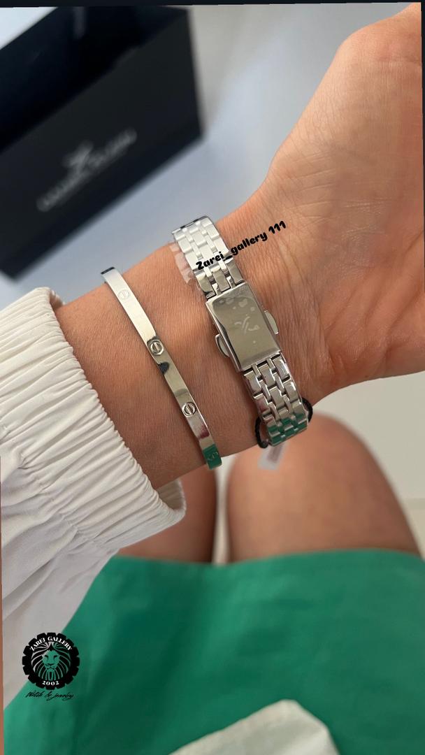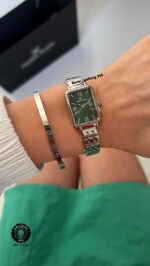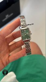 رنگ ساعت قاب و بند تمام استیل و صفحه سفید سبز با اعداد و عقربه استیل
