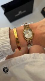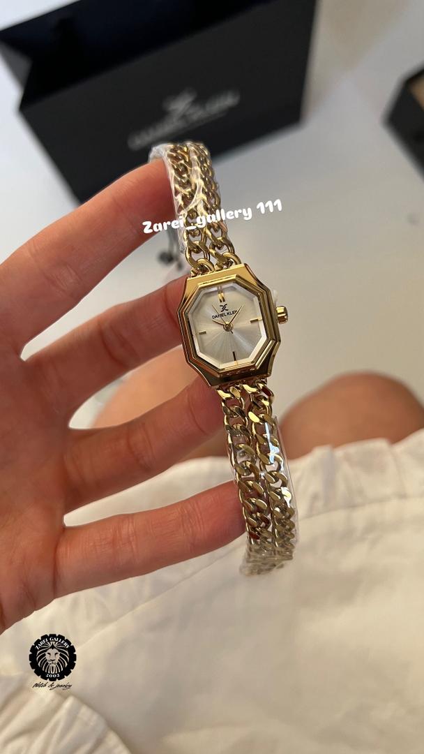 رنگ ساعت قاب و بند تمام طلایی و صفحه نقره ای استیل با اندکس و عقربه طلایی