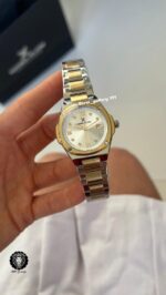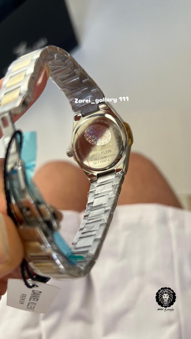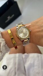 رنگ محصول ساعت دو رنگ طلایی استیل و صفحه نقره ای با اعداد و اندکس طلایی و نگین تمام مخراج بدون ریزش