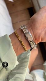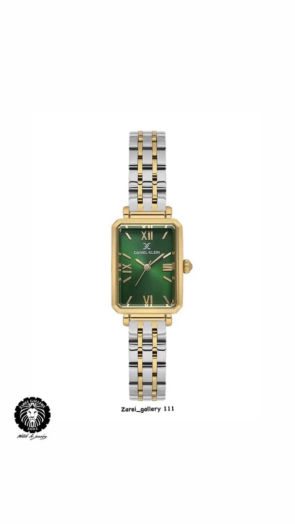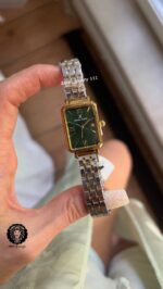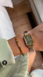 رنگ ساعت قاب طلایی و بند دو رنگ طلایی و استیل و صفحه سبز با اعداد و عقربه طلایی