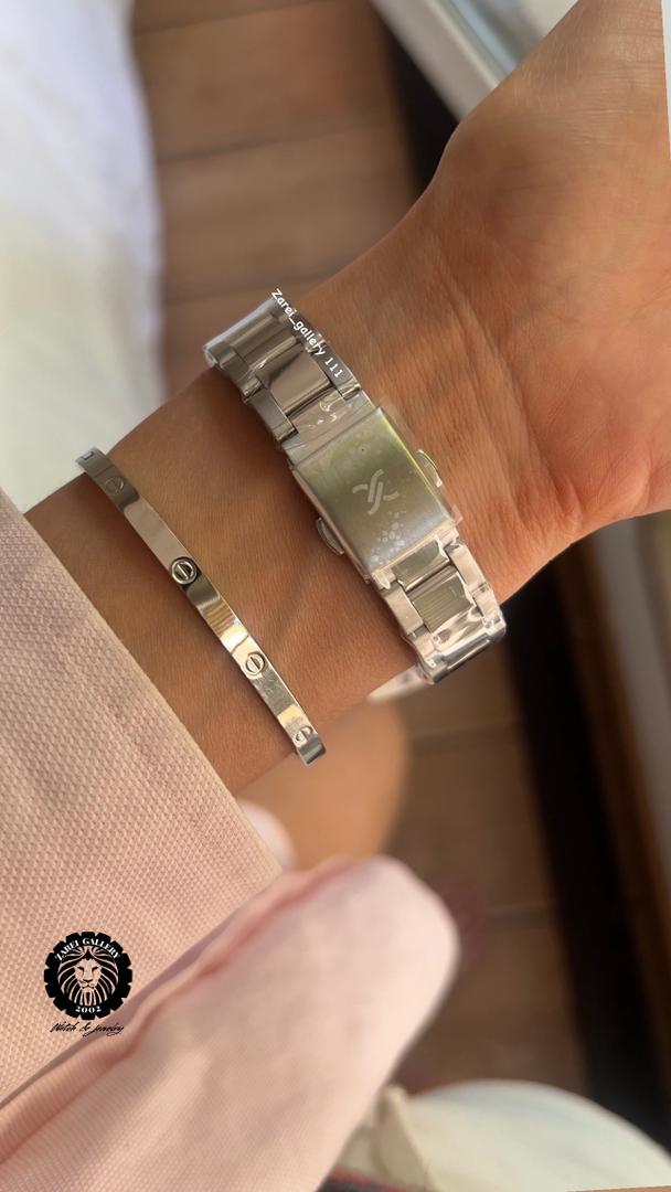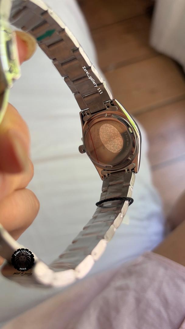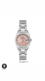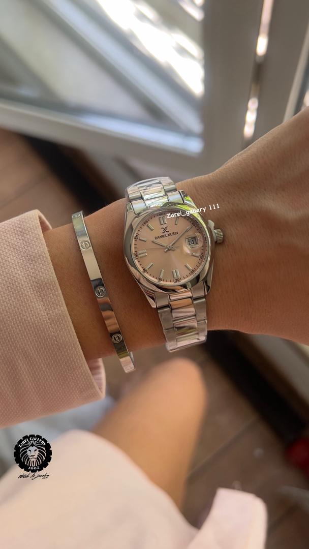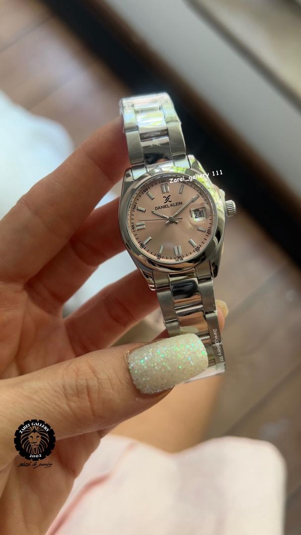 رنگ ساعت قاب و بند تمام استیل و صفحه سفید صورتی ملایم با اعداد و عقربه استیل