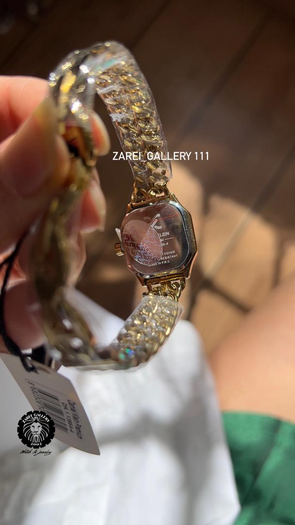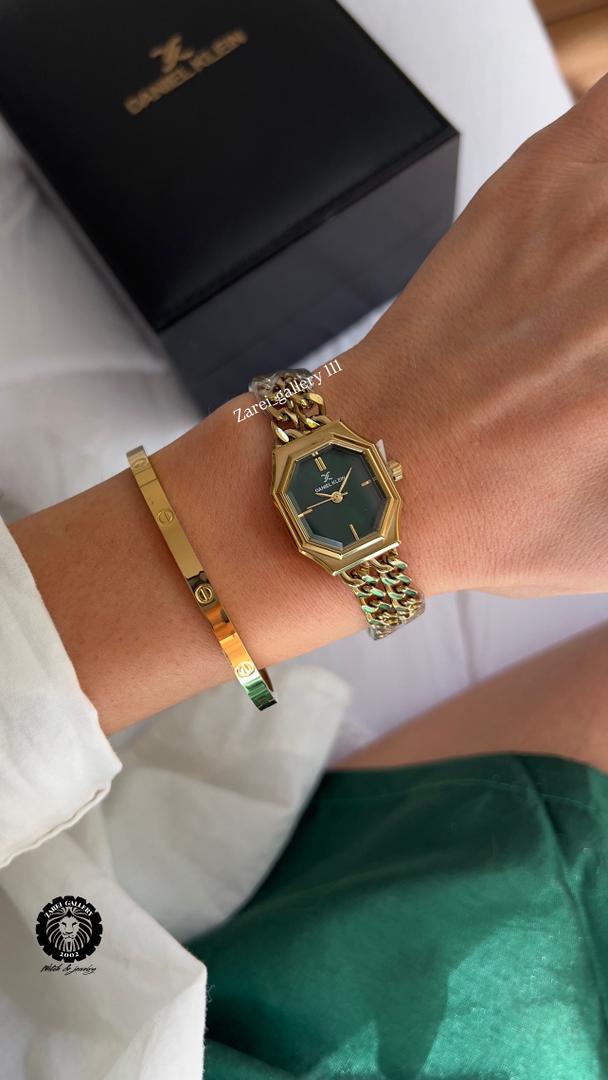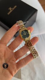 رنگ ساعت قاب و بند تمام طلایی و صفحه سبز با اندکس و عقربه طلایی