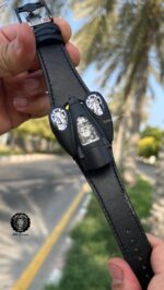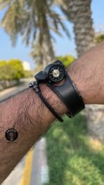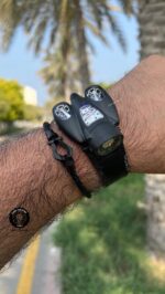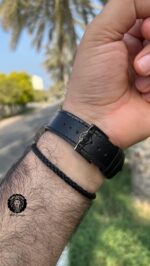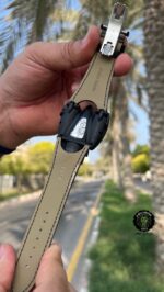 بند مشکی دو طرف چرم ساده طبیعی و دور دوخت با حک برند بر روی سگک بند و حک مشخصات در پشت بند و با بالاترین متریال