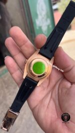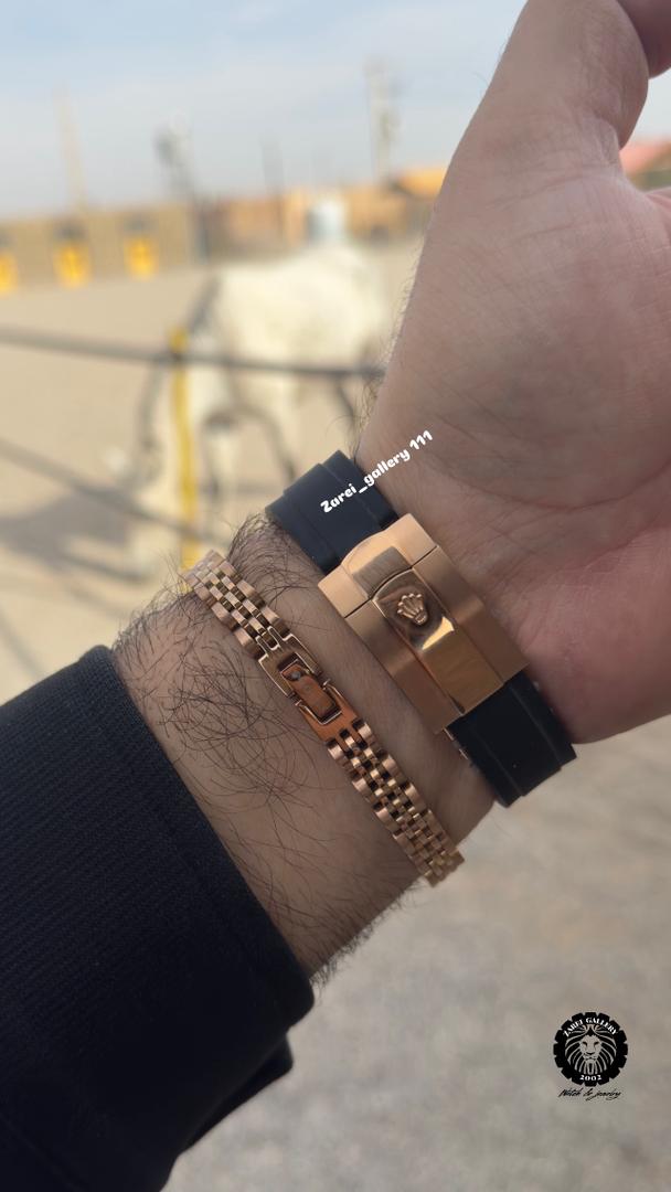 بند رابر سیلیکونی با کیفیت با حک برند و مشخصات در پشت بند و به همراه قفل تمام رزگلد استیل با حک برند و مشخصات متریال داخل قفل با پلاک یک تیکه و پلاک متحرک با لوگوی تاج رولکس روی پلاک قفل