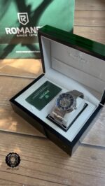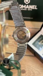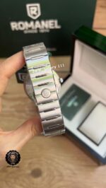 صفحه ساعت دور سرمه ای و در وسط موتور سویسی از چرخ دنده های استیل به کار رفته که به زیبای دو چندان ساعت افزوده