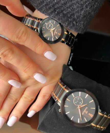 ساعت با قاب تمام استیل ضد آلرژی و حساسیت حک برند رومانل در کنار قاب