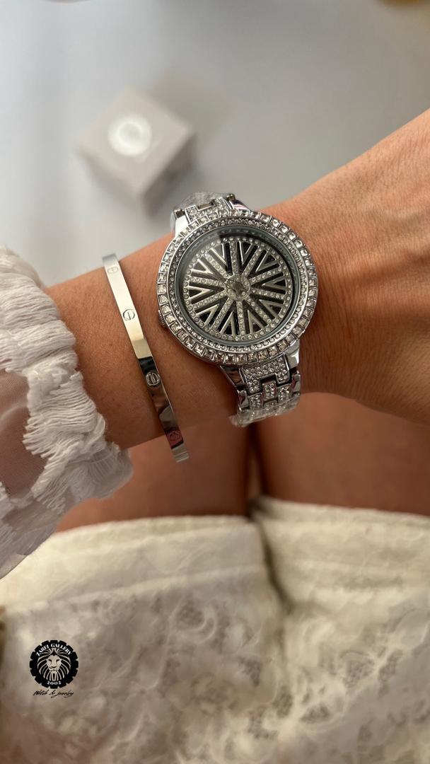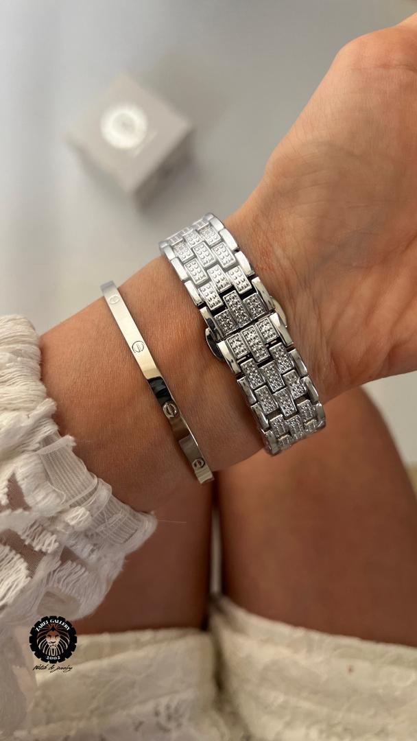 قاب دور نگین باگت با بند ریز بافت کامل فول نگین تمام نگینها از برند سوارسکی و تمام مخراج بدون ریزش با قفل دکمه ای پروانه ای