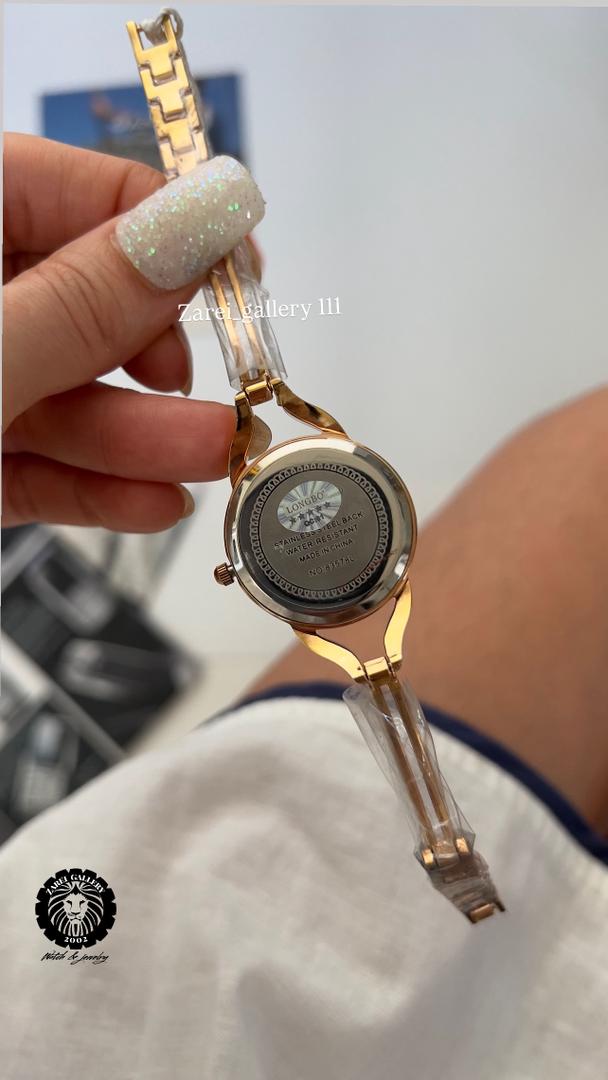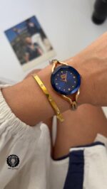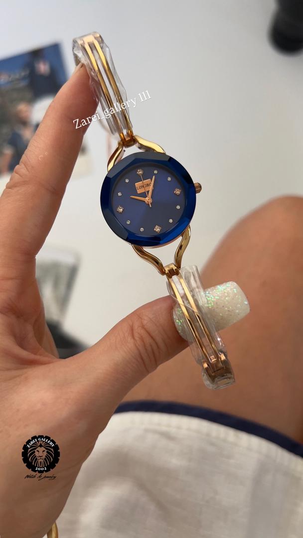 ساعت رنگ ثابت و بدون تغییر رنگ بند النگویی دو لاینه با صفحه سرمه ای و نگینهای کار شده برای اعداد و شیشه به کار رفته از کریستال دور تراش الماسی و نگینهای اعداد بدون ریزش و دارای پایه و از جنس سنگ سوارسکی می باشد