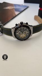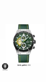 رنگ محصول قاب استیل رینگ مشکی و بند چرمی سبز با دوخت زرد و صفحه برجسته سبز زرد