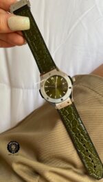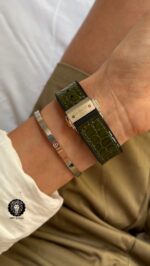 بند رابر با روکش چرم پوست کرودکیلی سبز زیتونی دور دوخت و بسیار با کیفیت با حک مشخصات برند در پشت بند و با بالاترین متریال