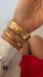 بند حصیری استیل با تیکه بند که در انتهای هر طرف کوتاه میشود و قفل پروانه ای استیل با حک ورساچه روی قفل
