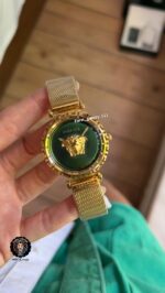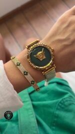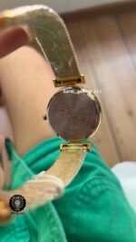 بند حصیری طلایی با تیکه بند که در انتهای هر طرف کوتاه میشود و قفل پروانه ای استیل با حک ورساچه روی قفل