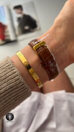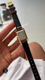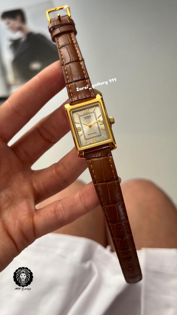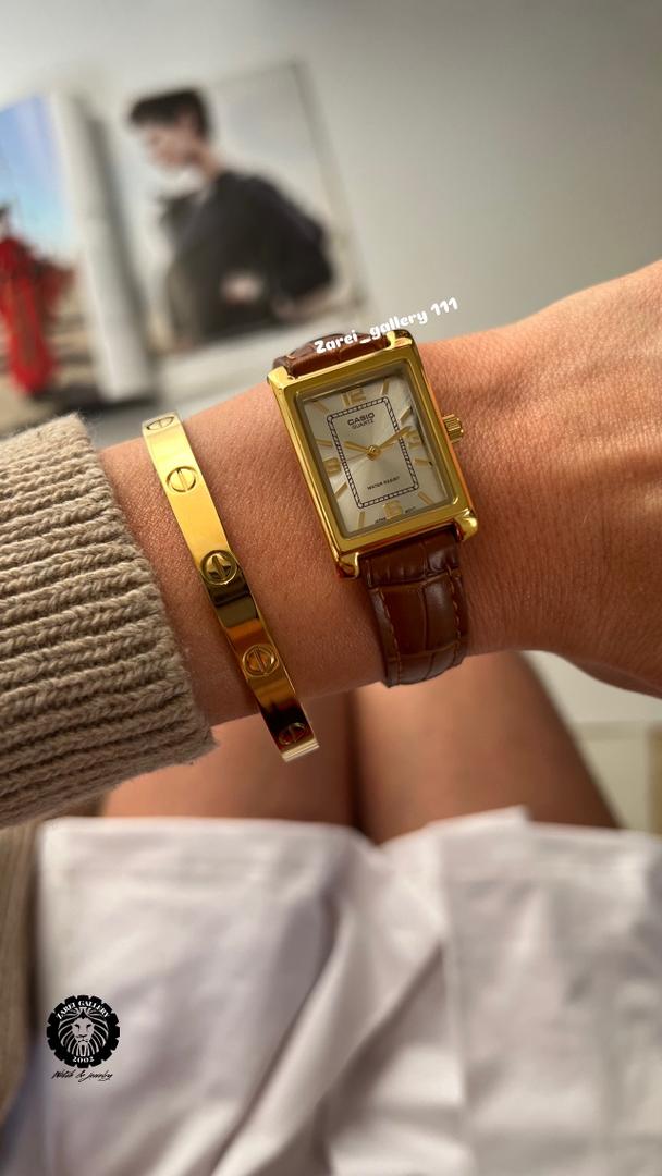 رنگ محصول قاب طلایی بند چرم قهوه ای شتری با صفحه نقره ای با شماره های و عقربه های طلایی