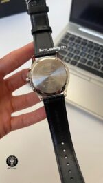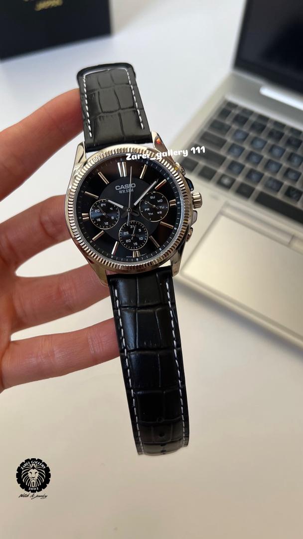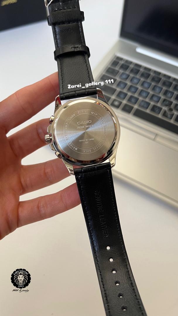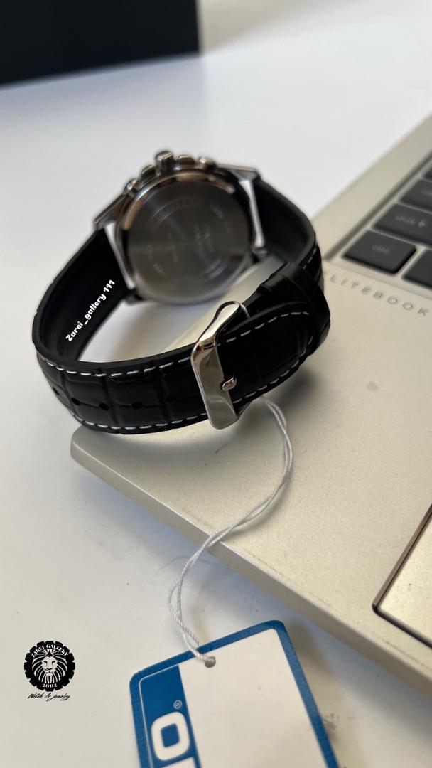 رنگ محصول قاب تمام استیل صفحه مشکی با اندکس و عقربه استیل و بند چرمی مشکی