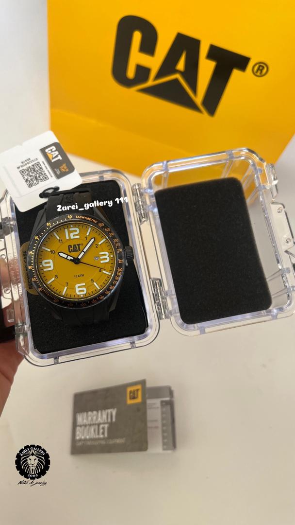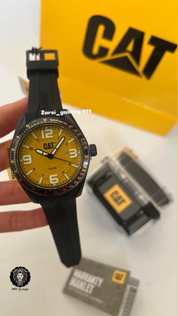 رنگ محصول قاب مشکی مات و صفحه زرد و بند سیلیکونی مشکی با اعداد سفید و عقربه مشکی