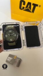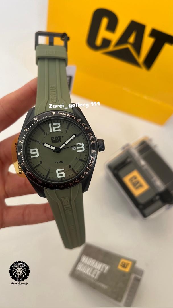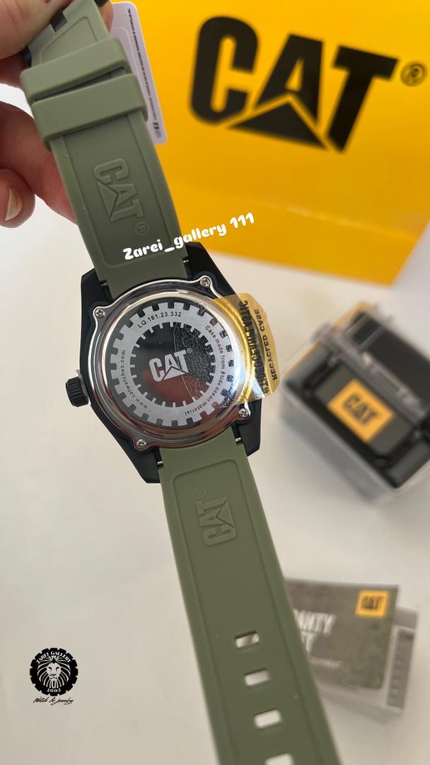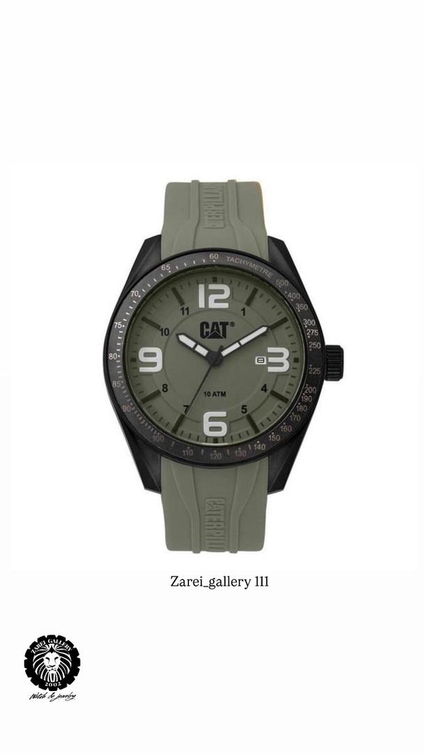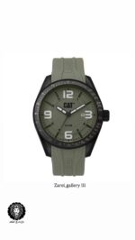 رنگ محصول قاب مشکی مات و صفحه سبز ماچایی یا زیتونی و بند سیلیکونی سبز با اعداد و عقربه مشکی و نوشته های مشکی