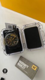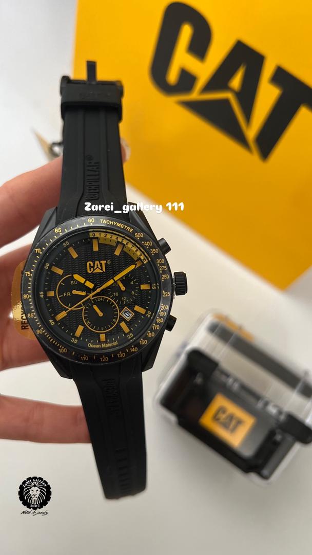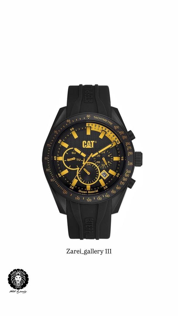 رنگ محصول قاب مشکی مات و صفحه مشکی و اعداد و عقربه های زرد و بند سیلیکونی مشکی